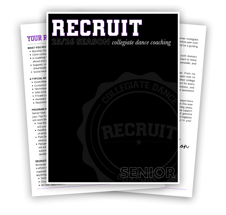 The support you will receive from RECRUIT is two-fold. With nearly over twenty years of experience in the dance industry, I am here to help educate and guide you and your dancer through this ever changing and evolving landscape. Together we will navigate strengths, weaknesses, training plans, clinic registrations, video submissions and more! Most importantly, your dancer will crave support through their recruitment. I will surround your dancer with resources, honesty, and genuine feedback to propel them to their goal and present them as a top recruit for their class. All logistics and deliverables aside, my number one mission is to provide confidence and leadership to your dancer to achieve her dreams - dancing on a college team.